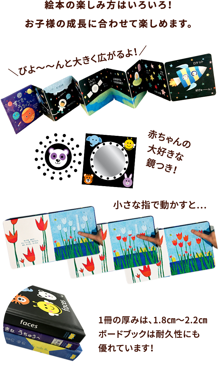 大人には簡単な動作でも、小さな子どもにとってはすべてが初めての挑戦。開く、めくる、ひっぱる、閉じるといった指先を使う動作を繰り返し行い、その動作を習得することで子どもたちの自信になり、集中力を育むことができます。