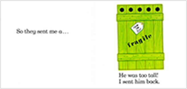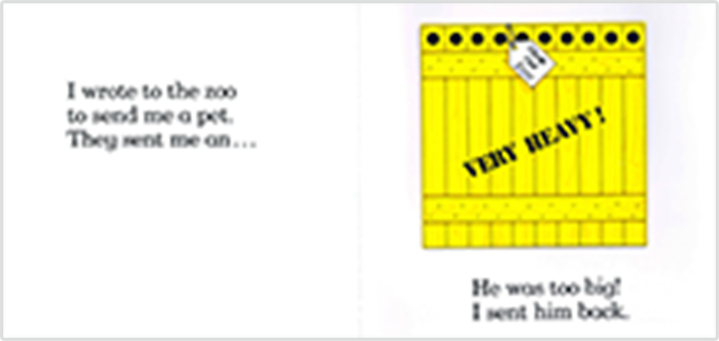ペットが欲しい子どもが動物園に手紙を送りました。 動物園が次々とお勧めの動物を送ってきますが、どれもペットにするには難しい動物ばかりが届きます。今度はぴったりのペットが届くのでしょうか?楽しいポップアップのしかけ絵本。 邦題:『おとどけものです。』(あすなろ書房)